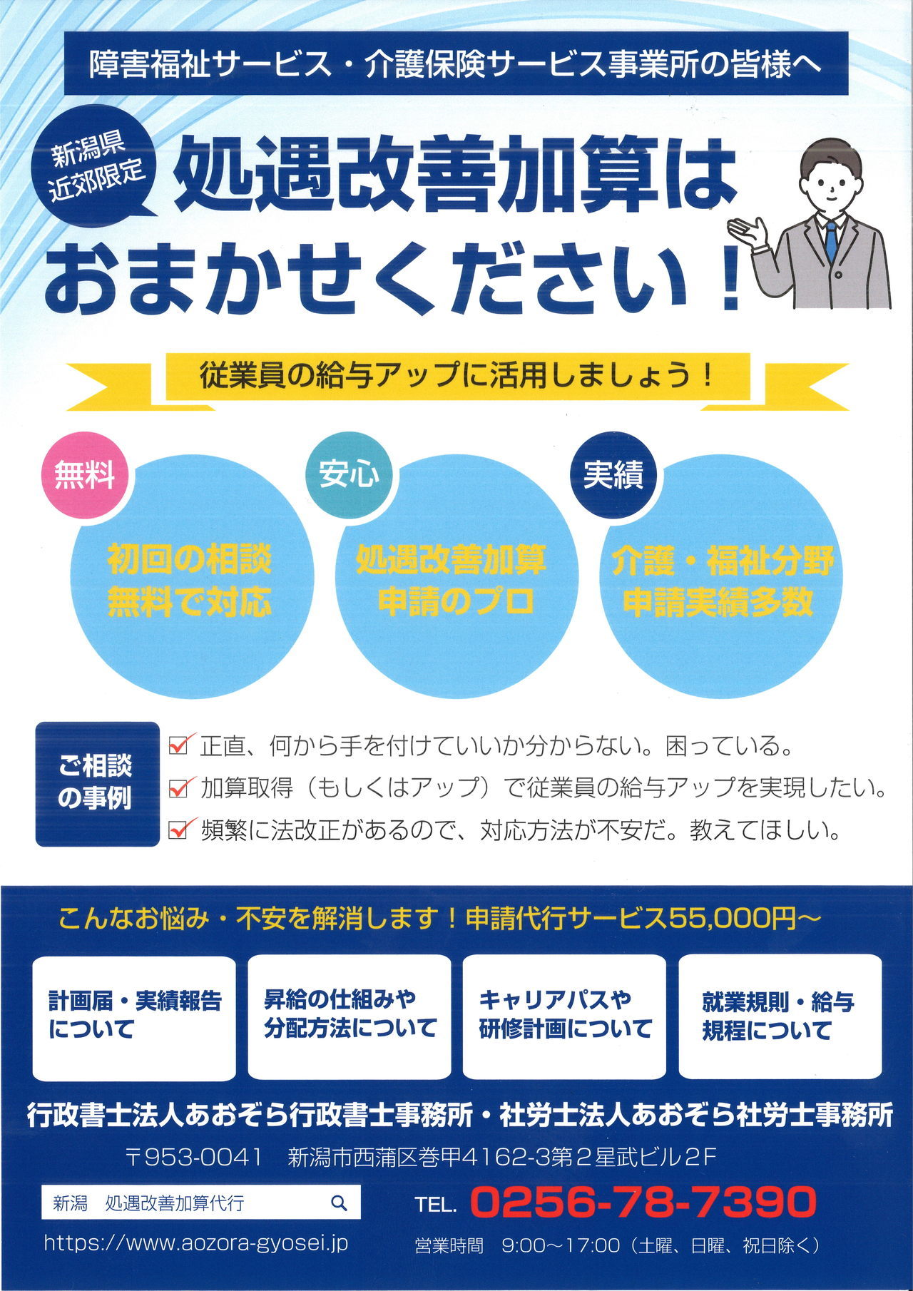 新潟の福祉・介護・保育分野の処遇改善加算は処遇改善加算専門(処遇改善加算に強い)のあおぞら行政書士事務所がトータルサポート